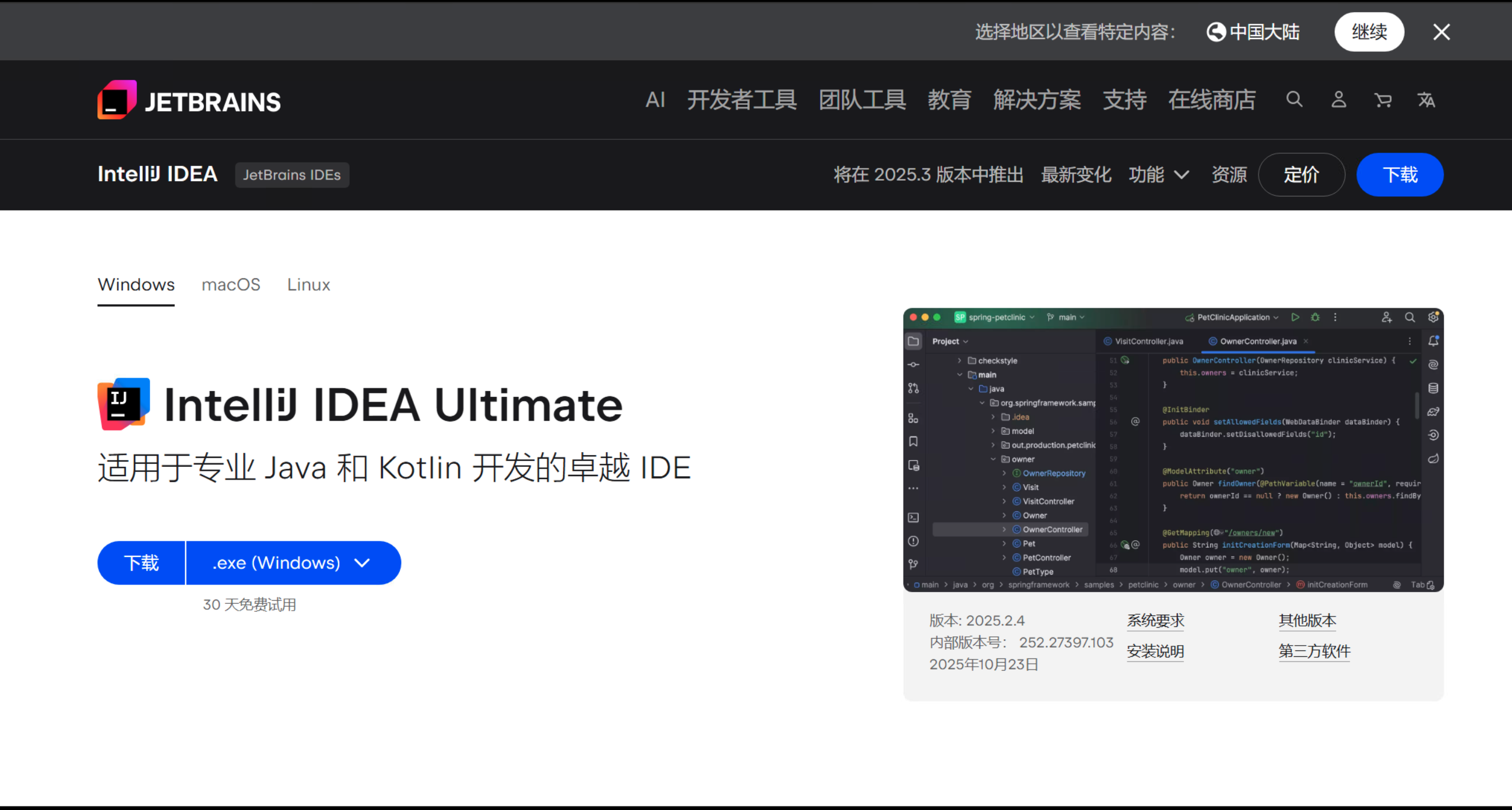 去官网下载 IntelliJ IDEA 2025.2.4。注意,必须下载专业版(Professional Edition),社区版虽然免费,但功能阉割得厉害,很多实用的特性都用不了。如果你打算激活,版本选错的话后面全白费。