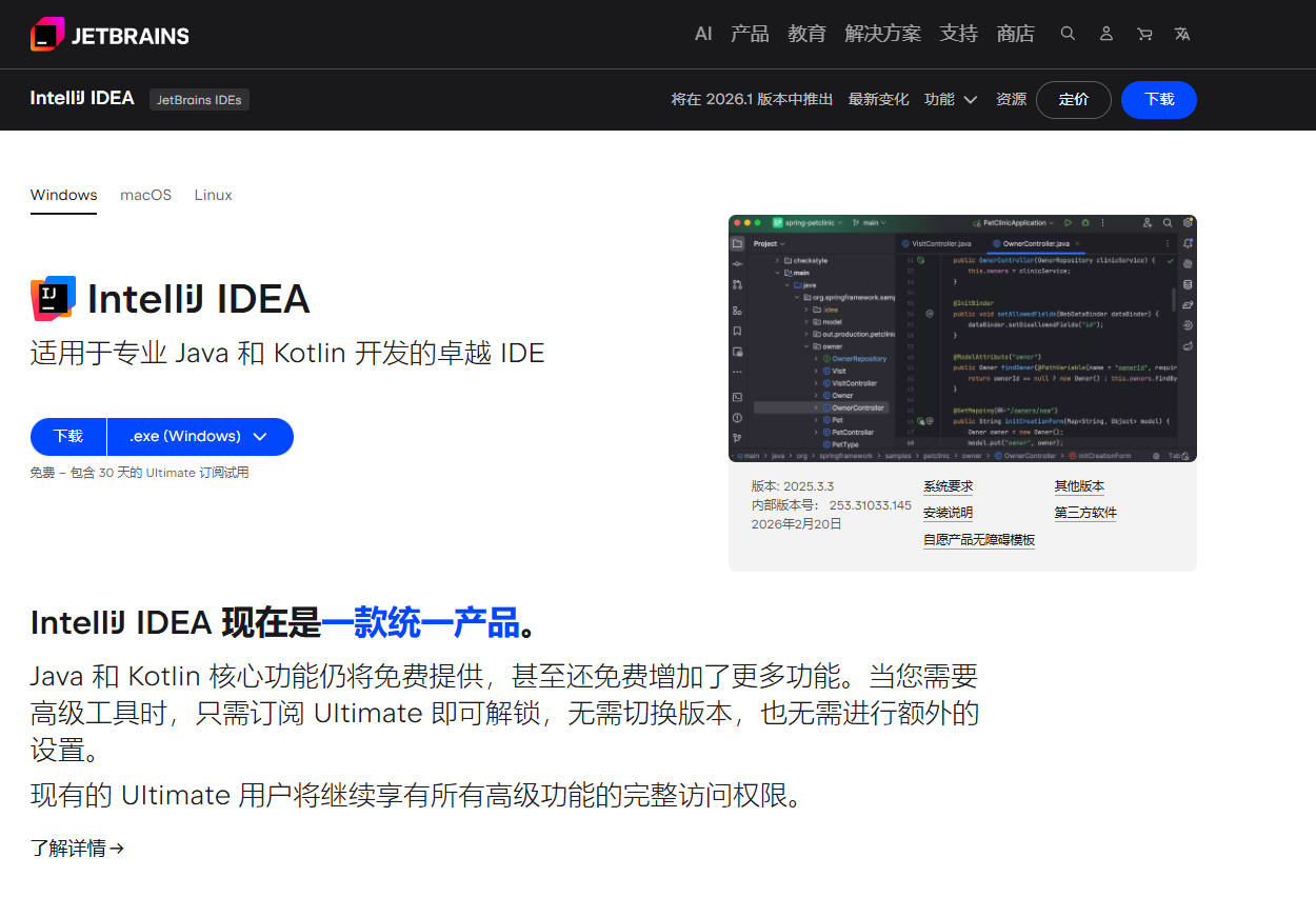 IDEA 2025.3.3最新版于2026年2月20日发布了,作为 2025.3 大版本的第三个补丁,主打 “修修补补,让位子更稳”。它没有引入花哨的新功能,而是集中火力解决了一堆让你之前可能“血压升高”的 Bug。