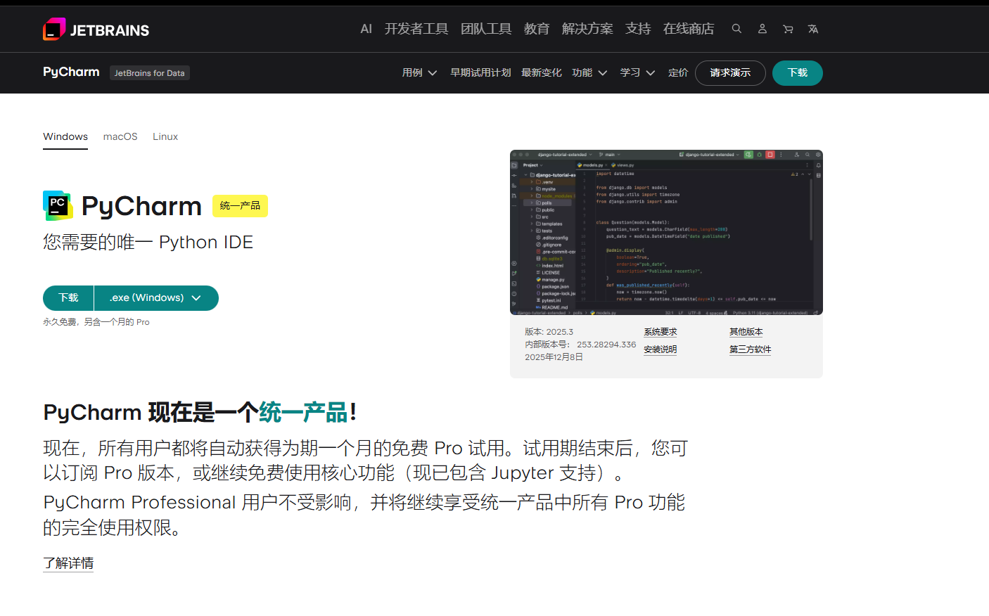🖥️ 步骤一:下载 Pycharm 2025.3 最新版